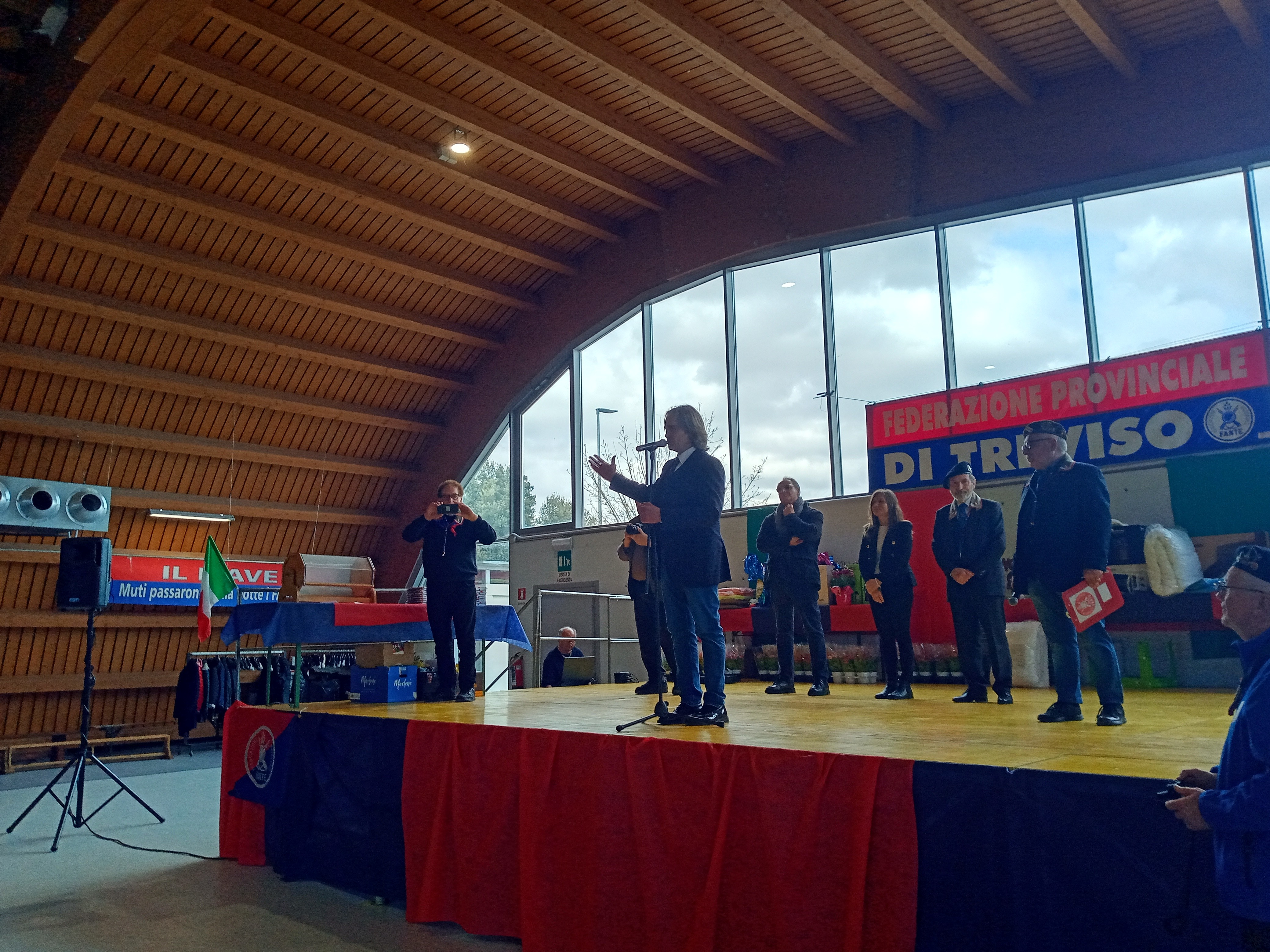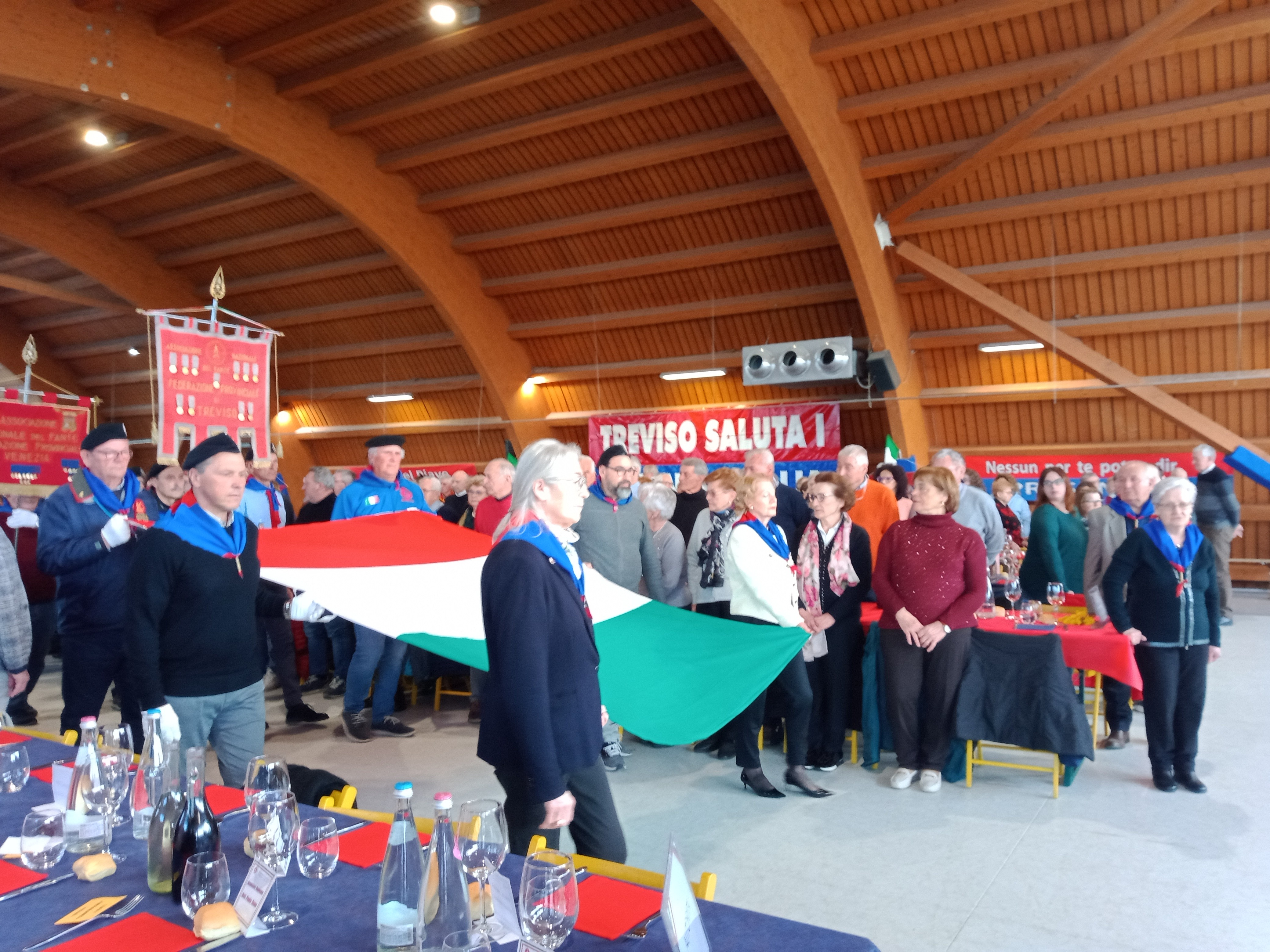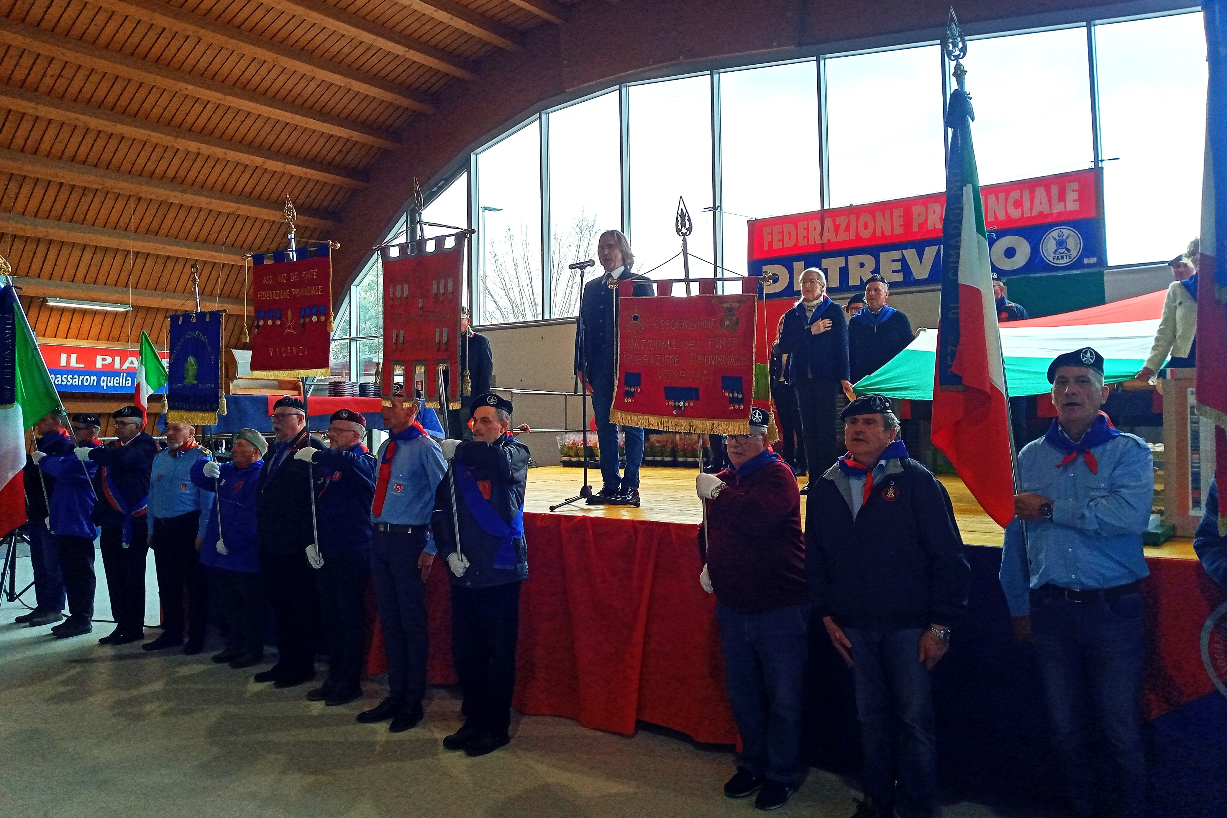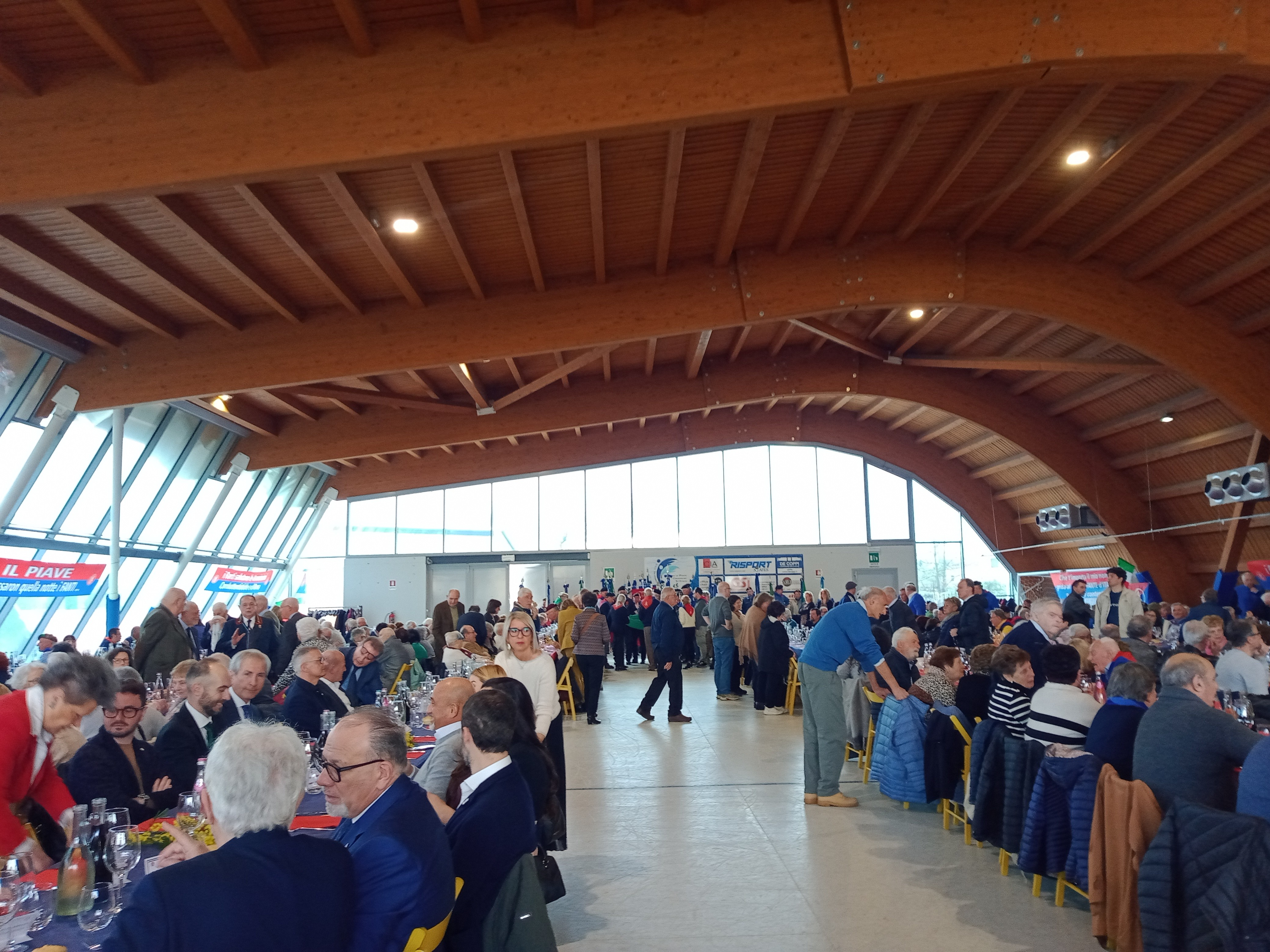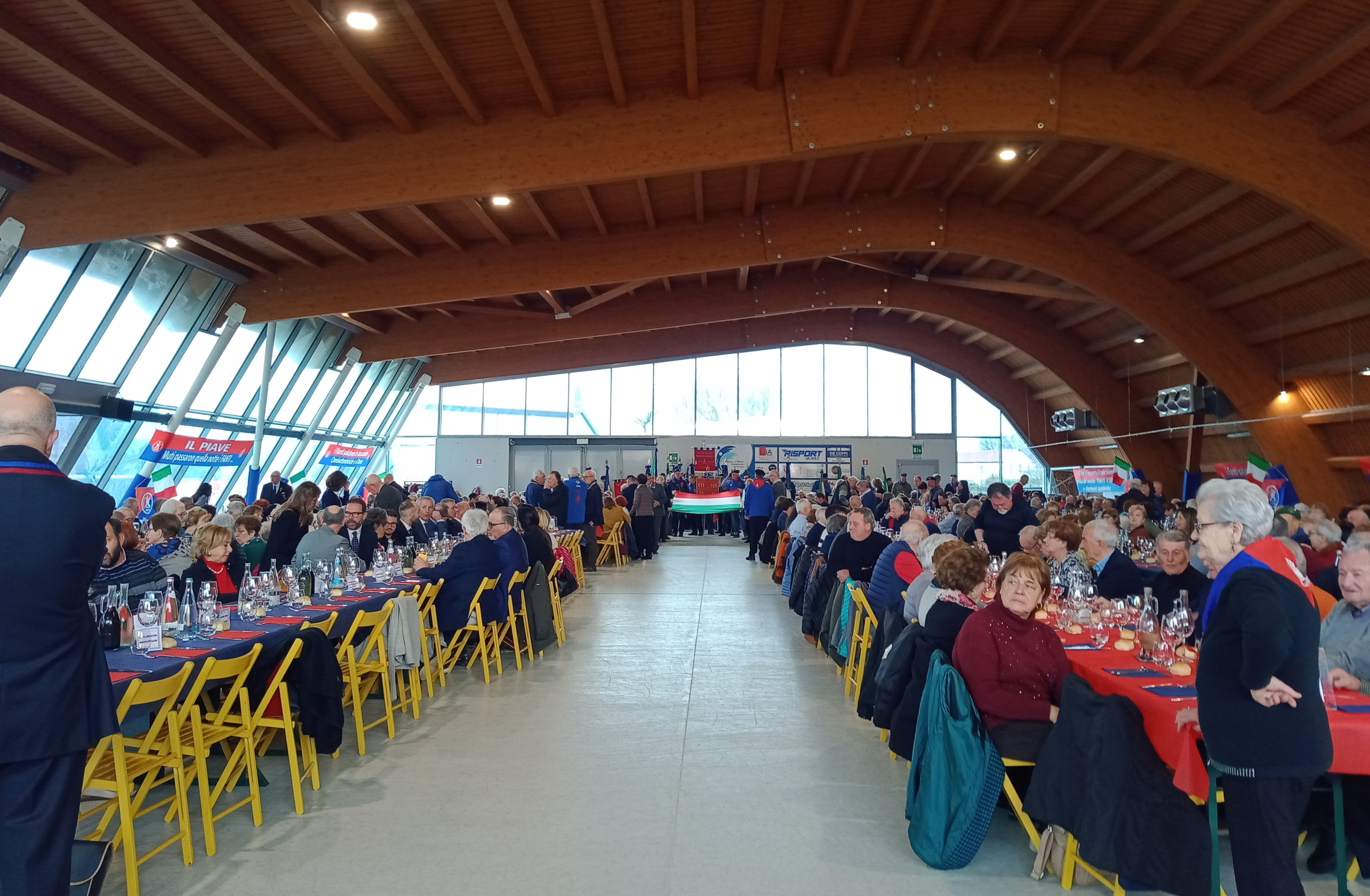 Pure il meteo è stato clemente. Per chi arrivava da ovest, sotto la pioggia, il passare sul Piave è stato un cambiamento di atmosfera e non solo in senso storico, metaforico, emblematico, ma anche in senso reale. Ad est del Fiume Sacro nuvole ma niente pioggia, anche se, comunque, tutto il cerimoniale e la festa – come da programma – si svolgevano all’interno della grande struttura.